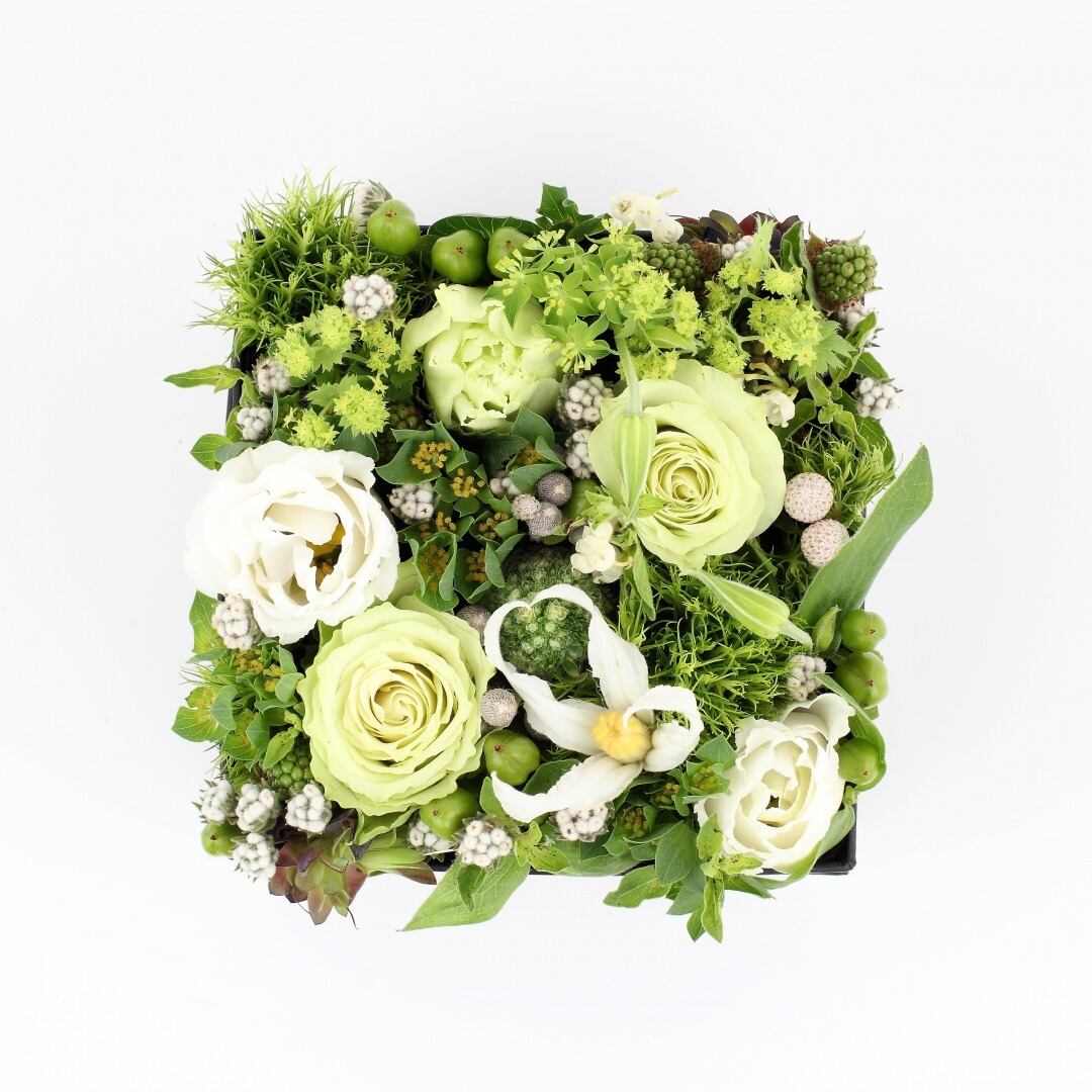 グリーンをふんだんに使い、白系でまとめたアレンジメント。